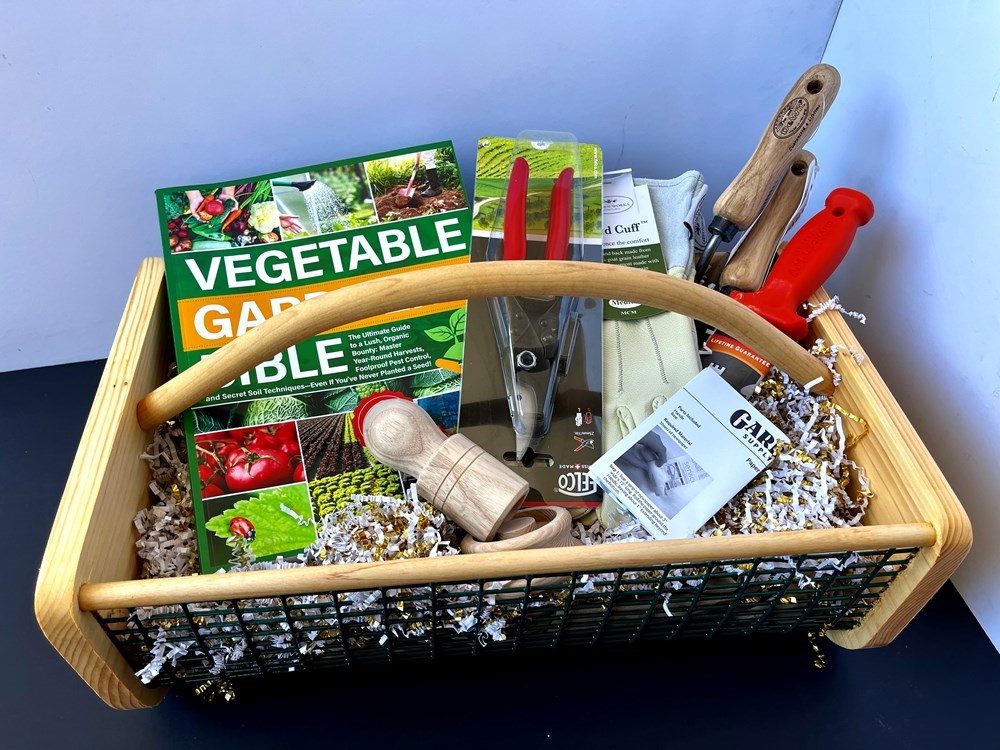 This thoughtfully curated basket is an ideal companion for gardeners at any stage of their journey, whether you’re just starting out or looking to enhance your well-loved toolkit. The basket includes: -Felco Pruners: Renowned for their precision and durability, essential for clean cuts and maintaining healthy plants. -Harvesting Trug: A practical and stylish basket for gathering your garden’s bounty. -Garden Gloves: Protect your hands while working with comfort and grip. -Paper Pot Maker: Create eco-friendly pots for starting your seedlings with no need to repot! Paper pots are biodegradable and can be transplanted right into the ground! -Soil Knife: A versatile tool for planting, digging, weeding, and cutting through tough soil. -Trowel: Perfect for planting and transplanting with ease. -Cultivator (5-tine): Ideal for aerating and preparing your soil for planting. -Weeder: Efficiently removes weeds to keep your garden healthy and vibrant. -The Vegetable Gardener's Bible: A comprehensive guide to growing your own vegetables with expert tips and techniques. Whether you’re cultivating a new garden or refining your skills, this basket provides all the essentials to support your gardening endeavors. Bid now and enjoy the satisfaction of nurturing your green space with top-quality tools and resources!